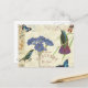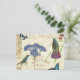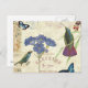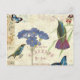 © Alain Pelletier/Wild Apple. A imagem mostra um buquê antigo de flores azuis com aves e borboletas. Um carimbo, um postal, algum texto e outros itens também podem ser vistos na imagem.