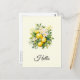 Um cartão postal com uma ilustração adorável de um buquê de limões rodeados por folhas e prigos de flores brancas.