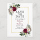 Anúncio de casamento do Noivado Floral Moderno Elegante Watercolor Burgundy Salve O Cartão-Postal de Data inclui peonias, lírios, folhas de eucalipto e outro belo verde numa moldura de ouro.