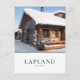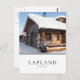 Cartão da foto de uma cabana rústica de madeira de madeira coberto de neve tradicional em Lapland no norte de Finlandia acima do círculo ártico com uma caixa branca com o texto "Lapland, Finlandia".