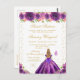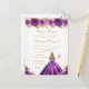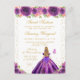 Este convite de aniversário de sweet sixteen elegante e glamoroso apresenta uma bela princesa com cabelos loiros e pele clara em um vestido de baile roxo escuro. O texto combina caligrafia manuscrita e fontes modernas sem serifa para uma aparência clássica e sofisticada. Os arranjos florais, borboletas e confetes dourados criam a combinação perfeita de rústico e chique.