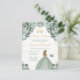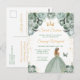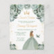 Este convite de aniversário de sweet sixteen elegante e glamoroso apresenta uma bela princesa com cabelos loiros em um vestido de baile verde sage. O texto combina caligrafia manuscrita e fontes modernas sem serifa para uma aparência clássica e sofisticada. Os arranjos florais, borboleta e confetes dourados criam a combinação perfeita de rústico e chique.