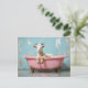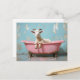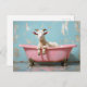 Uma pintura branca com uma cabra branca com chifres relaxando numa banheira rosa vintage, colocada contra uma parede azul clara para uma encantadora e divertida cena rústica.