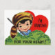 Este cartão mostra uma retrorreflecção de um garoto com um chapéu Davy Crockett que está nos arbustos. Há um coração atrás dele. A mensagem diz, "Estou caçando pelo seu coração". Aproveite seu novo cartão-postal de caça ao retro pelo seu coração!