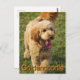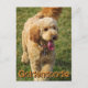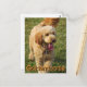 Este cartão-postal bonito mostra uma fotografia adorável de um cão Goldendoodle feliz. Fotografia criada pela fotógrafa Maria Jeffs, prêmio vencedora.