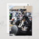 Um cão de beagle numa motocicleta cheio de capacete, óculos e colete de couro preto faz uma fotografia engraçada para enviar como um cartão de cumprimentos ou de aniversário a motociclistas.