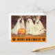 Deseje a todos um feliz Halloween este ano com este cartão postal engraçado e fofo com uma foto de três cães fantasiados de fantasmas! Mantenha esta foto engraçada ou adicione uma foto do seu próprio cão fantasiado para personalizar este cartão postal.