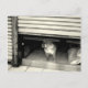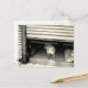 Fotografia branca e preta de um buldogue minúsculo giro olhando pela janela. Ele parece triste e solitário.
