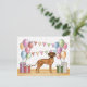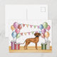 Ilustração de desenho animado original de Destei de um adorável cão da raça Rhodesian Ridgeback. O cão está colocado num cenário colorido de aniversário com balões de aniversário em cores pastéis, presentes e uma bandeira de bunting. As cores pastéis incluem rosa, verde, azul, vermelho, laranja e roxo. O cão está em pé numa textura de piso de madeira amarela e o fundo tem um padrão divertido de bolinhas em cores pastéis.