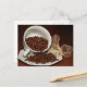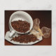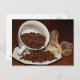 Mande um alô com esta fotografia de uma xícara de café branca e um pires com grãos de café a derramar.
