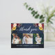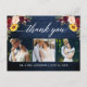 Caligrafia Moderna, Aquarela Elegante Burgundy Marsala Floral, Casamento 3 Cartão de Agradecimento de Foto inclui rosas burgundy, rosas vermelhas, rosas rosa, girassóis e folhagens. Azul Rústico Madeira.