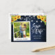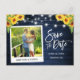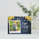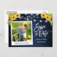 Estilo Moderno de Pincel, Estilo de Câmera Instantânea, Foto do Casal Salvar a Data de Anúncio de Noivado Cartão Postal - País Rústico Madeira Azul, Luzes de Corda. Inclui Floral de Girassol Aquarela e folhagens botânicas.