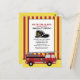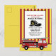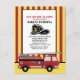 Cartão postal de convite para festa de 5 anos de criança bombeiro / caminhão de bombeiros com listras vermelhas e amarelas. O texto diz, "Toque o alarme, NOME_DA_CRIANÇA está fazendo 5 anos." Adicione suas próprias instruções na parte inferior. O nosso diz, "Traga uma muda de roupa. Vamos ficar molhados."