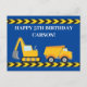 Cartão de aniversário personalizado de escavadeira de construção legal para um menino que ama veículos de construção amarelos em preto e amarelo. Decoração de festa de veículo azul divertido para crianças que amam carros e caminhões basculantes. Personalize com o nome da criança sob a fita de advertência preta e amarela com uma mensagem de feliz aniversário personalizada incluindo o nome e a idade deles.