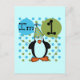 Os primeiros camisetas de pinguins de aniversário do bebê, fócitos, ímãs, bolsas e muito mais com pinguim vestindo um chapéu de festa, balões e bolinhas de azul e verde, e texto que diz que eu tenho 1.