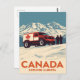 Send a rugged and adventurous piece of Canadian travel art with this postcard! Inspired by classic mid-century travel posters, this illustration captures the spirit of off-road exploration in Alberta, Canada. The design features a bold, red and white all-terrain vehicle adorned with the iconic Canadian maple leaf, set against a dramatic backdrop of snow-capped mountains. Two explorers are visible, taking in the vast, winter landscape.
