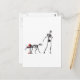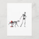 Esqueleto andando com seu cão esquelético que está pausando por um hidrante de incêndio esquelético.
