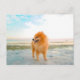 Belo cão Pomerano laranja parado na areia no cartão postal da praia. Muito espaço para personalizar com seu próprio texto.
