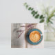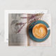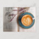 Cappuccino em um pires azul sobre um livro de flores ilustrado com um pinto roxo de ervas.