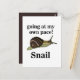 Caracol indo para o meu próprio espaço Caracol Engraçado Caracol Caracol Cartão-Postal original de Nisha Prabhu. Abraça o teu caracol interior com este cartão postal, perfeito para aqueles que marcham até ao batuque do seu próprio tambor! Apresentando uma ilustração encantadora de um caracol alegre, este design encantador incorpora o mantra 'Ir ao Meu Próprio Ritmo'. Quer você esteja enviando um bilhete a um amigo ou mantendo-o na sua mesa como um lembrete para levar a vida devagar, este cartão postal irradia positividade e humor. É justo para os entusiastas do correio de caracol e para qualquer um que aprecie a beleza de uma viagem lúcida. Compartilhe um sorriso, espalhe alguma alegria, e lembre-se - não é o destino, mas a viagem encantadora que conta!