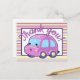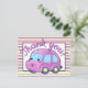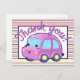 Bipe! Um carro cor-de-rosa fofo enquadrado pelas palavras "Obrigado!" num cartão postal.