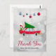 Cartão postal de agradecimento com um velho carro vermelho legal carregando um pinheiro de Natal verde no seu teto e um presente guardado no porta-malas aberto.