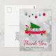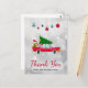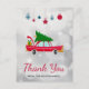 Cartão de agradecimento com um velho carro vermelho legal carregando um pinheiro de natal verde no seu teto e um presente guardado na mala aberta.