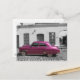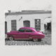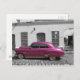 Um carro cor-de-rosa ou roxo está estacionado à luz do sol na velha cidade de Trinidad em Cuba. O fundo é transformado em preto e branco para deixar o carro se destacar mais.