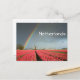 Cartão-postal de um arco-íris colorido num céu escuro sobre um moinho de vento e um cheio de campo de tulipas vermelhas brilhantes durante uma tempestade primavera num cenário perto de Amesterdã, nos Países Baixos, e o texto: "Países Baixos".