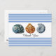Este cartão-postal estilo Praia apresenta três conchas marinhas em um fundo listrado azul e branco. Há um espaço para um cumprimento. Compre como mostrado com o cumprimento de agradecimento ou adicione seu próprio texto, como "Salve a Data" ou "Feliz Aniversário". A escolha é sua. Há um cumprimento no verso que pode ser personalizado com suas próprias palavras.