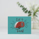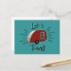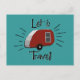 O design retrô neste cartão postal lembra os anúncios de impressão dos anos 50 e 60 com uma campista de lágrimas em vermelho e prata vintage e a frase "Vamos viagem!" Da minha imagem original criada digitalmente.