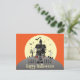 Deseje a todos um feliz Dia das Bruxas este ano com este cartão postal bonitinho com uma casa assombrada com um tema de fantasma e morcego!