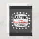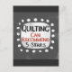 Um design tipográfico engraçado que diz "Quilting: Can Recommended, 5 Stars". É texto preto e vermelho em um retângulo branco com pontos brancos engraçados e brincalhões ao seu redor, tudo em um fundo de cinza.