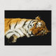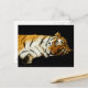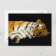 Uma fotografia de um Tigre Amur dormindo sobre um fundo preto. Também conhecido como Tigre Siberiano, o Amur está muito perto da extinção na natureza. Restam apenas algumas centenas. O tigre Amur foi extinto na Coreia do Sul em 1922, desde então houve esforços de conservação para salvar essa espécie. Os nossos esforços para salvar esta espécie parecem estar a falhar com a população de tigres a continuar a diminuir devido à caça e à perda de habitat.