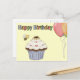 Cartaz feliz de aniversário divertida, com gráficos country caprichosos de um cupcake de chocolate, decorados com uma margarida, no topo, e corações por toda parte. Uma doce abelha de desmoronamento, o cupcake de girassol e um bando de balões decoram o canto superior direito do cartão. Feliz aniversário em texto preto colorido, no topo. Personalize adicionando qualquer texto desejado à parte traseira da placa. Excelente como cartões de aniversário corporativos e perfeito para os clientes de aniversário de um negócio de padaria.