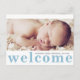 Você pode facilmente compartilhar suas notícias entusiasmantes com este cartão postal de anúncio de nascimento de fotos. Na frente da placa, o texto azul personalizado (mostrado como "bem-vindo") aparece abaixo de uma grande foto. O nome do seu bebê e a data de nascimento também estão na frente. A parte traseira do cartão-postal inclui espaço para gravar uma mensagem pessoal para os destinatários.