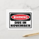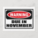 Aviso devido em NOVEMBRO Cartão postal, você pode personalizar em www.WarningSignShirts.com e apresenta um sinal de aviso vermelho e preto e DUE EM NOVEMBRO em negrito para avisar o mundo. Você também pode personalizar seu próprio sinal de aviso Cartão postal com o texto desejado.