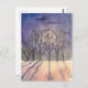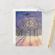Árvores de inverno abafadas lançam longas sombras sobre uma paisagem nevada. Cores d'água originais.