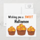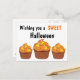 Cartões postais apresentam 3 cupcakes de Halloween com glacé de laranja e milho doce no topo diz, Desejando um Halloween DOCE.