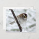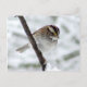 Este cartão-postal apresenta um bonito Sparrow Ameaçado Branco num galho coberto por neve. Um cartão postal bonito de aves de inverno para compartilhar com amantes de animais e aves.