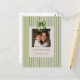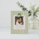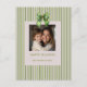 Um cartão festivo que você pode personalizar com sua própria foto.A design inclui elegantes faixas verdes verticais em um fundo branco, um arco decorativo de fita verde no topo, e a saudação "Felizes Feriados" em texto verde, seguido do nome de sua família em caracteres menores. O layout é simples, mas elegante, perfeito para enviar saudações sazonais. Cade Design Compro ©