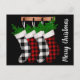O cartão moderno Rustic Holiday apresenta meias de xadrez de búfalo recheadas com tochas de abetos e texto vertical personalizável sobre fundo preto.