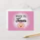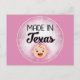 Este cartão-postal engraçado mostra uma linda face branca de bebê que diz "Made In Texas" em um fundo cor-de-rosa. Perfeito para novos anúncios de bebês ou apenas para diversão.