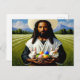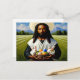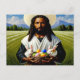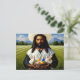 Este cartão postal de Páscoa personalizado apresenta uma imagem de Jesus Negro segurando dois coelhos junto com um cesto de ovos de Páscoa. Esta foi a minha rotação criativa na combinação de dois temas. Este cartão postal faz um presente Páscoa excelente para os da fé cristã.