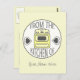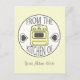 Cartão-postal de receita com uma ilustração de fundo esbranquiçado e círculo branco no centro. Ilustração de um fogão amarelo retrô com um coração em cada lado e texto acima e abaixo do qual se lê "Da Cozinha de" dentro. Personalize com seu nome no final. O lado oposto apresenta um retângulo branco com bordas escaladas de cinza e cantos de fotos antigos à direita. O retângulo de dentro de texto diz "Receber". Procure itens correspondentes na Paperie de Jill.