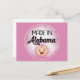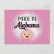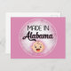 Este cartão-postal engraçado mostra um lindo rosto branco de bebê que diz "Made In Alabama" em um fundo rosa. Perfeito para novos anúncios de bebês ou apenas para diversão.