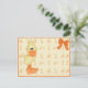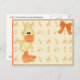 Um pequeno pato amarelo giro num fundo amarelo pálido. O fundo tem muitos patos pequenos em várias poses e um arco laranja bonito no canto superior direito.