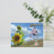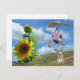 Amigos de animais em jogo. O coelho com uma cenoura está vendo um porco rosa voando seu planador pendurado sobre um girassol Nuvens brancas Fluffy no céu azul sobre uma colina pastosa.