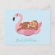 Um cartão postal com uma preguiça fofa que está arrepiando com uma bebida de suco deitada preguiçosamente em um flamingo rosa flutuante. A cor de fundo pode ser alterada no modo de personalização. O texto diz "Apenas Refrigerindo". Whimsical, trendy e design divertida para o verão!