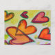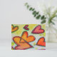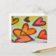 Pêssego, rosa e corações cor de laranja voam através da pintura como folhas de queda soltas pegas em uma brisa. Um contorno verde traça cada coração. Pontos de cor amarelo pálido são como confete entre os corações. A pintura a aquarela tem uma camada clara de ouro e rosa no topo. Personalize este cartão postal com o seu texto e imagens pessoais!